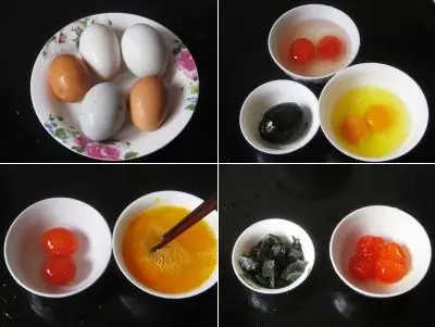 2.把皮蛋剝去殼,咸鴨蛋與雞蛋分別磕入碗內