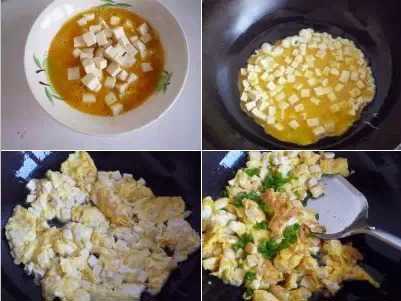 5.加入食鹽的雞蛋打散。加入切好的豆腐丁拌勻。