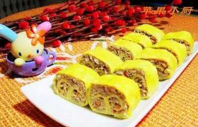 7.將拌好的餡,均勻的平鋪在蛋皮上面。