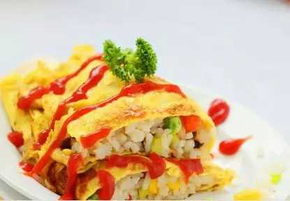 14.迅速蛋皮固定,盛入盤中,淋上蕃茄醬即可。