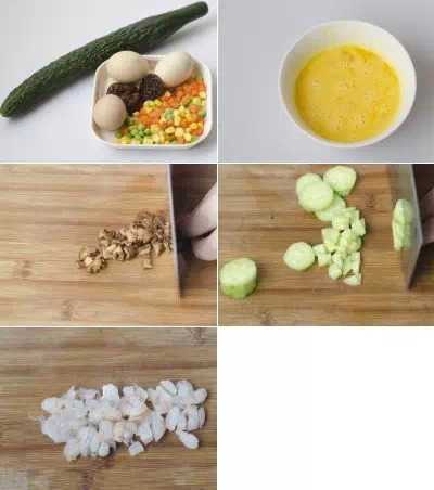 主料:剩飯500g、青瓜20g、雞蛋50g、雜蔬100g、香菇10g、蝦仁20g