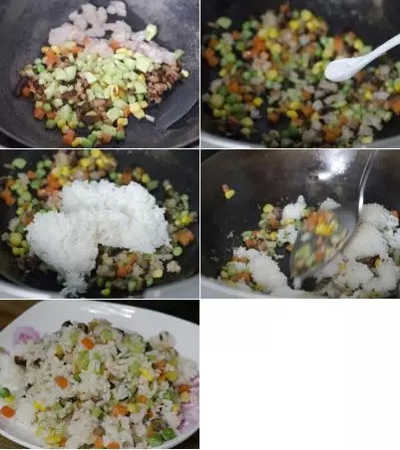 6.鍋內熱油至七分熱時倒入除剩飯外所有的炒飯材料翻炒兩分鐘