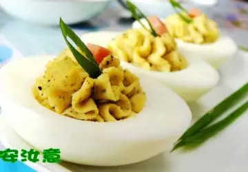 7.擠入蛋清托,表面加蔥葉,香腸粒裝飾即可。