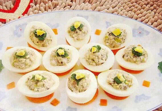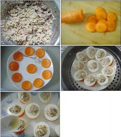 12.將調好的餡料填入蛋白,然后將填好餡的蛋白放到胡蘿卜片上。蒸鍋中放適量水,用大火燒開,將裝好盤的雞蛋上屜蒸約10分鐘