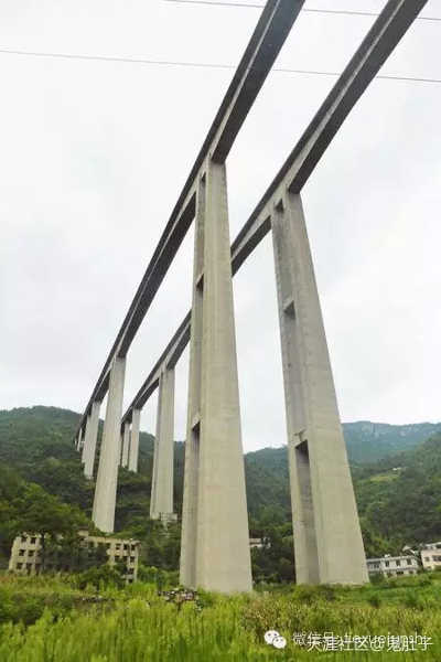 巨大的“龍潭河高架橋”,包括幾個每個200米的主跨,橋面距離地面近200米。這是世界第二高的多跨高架橋,僅次于著名的法國米約大橋。中國在建的赤石和三水河高架橋,將使龍潭河大橋退居第四名。不過這座橋仍然非常雄偉壯觀。(有178米高的橋墩,周邊植被非藏茂密)