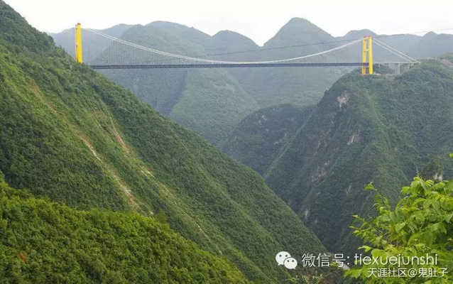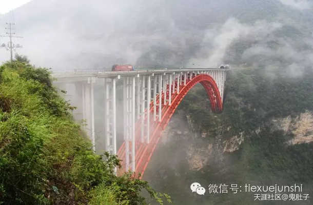 這是世界最高的拱橋——鋼管混凝土拱橋“支井河大橋”,292米高。云雨中此橋顯得尤其壯觀,其跨度有430米,同樣能排在世界拱橋前12位。